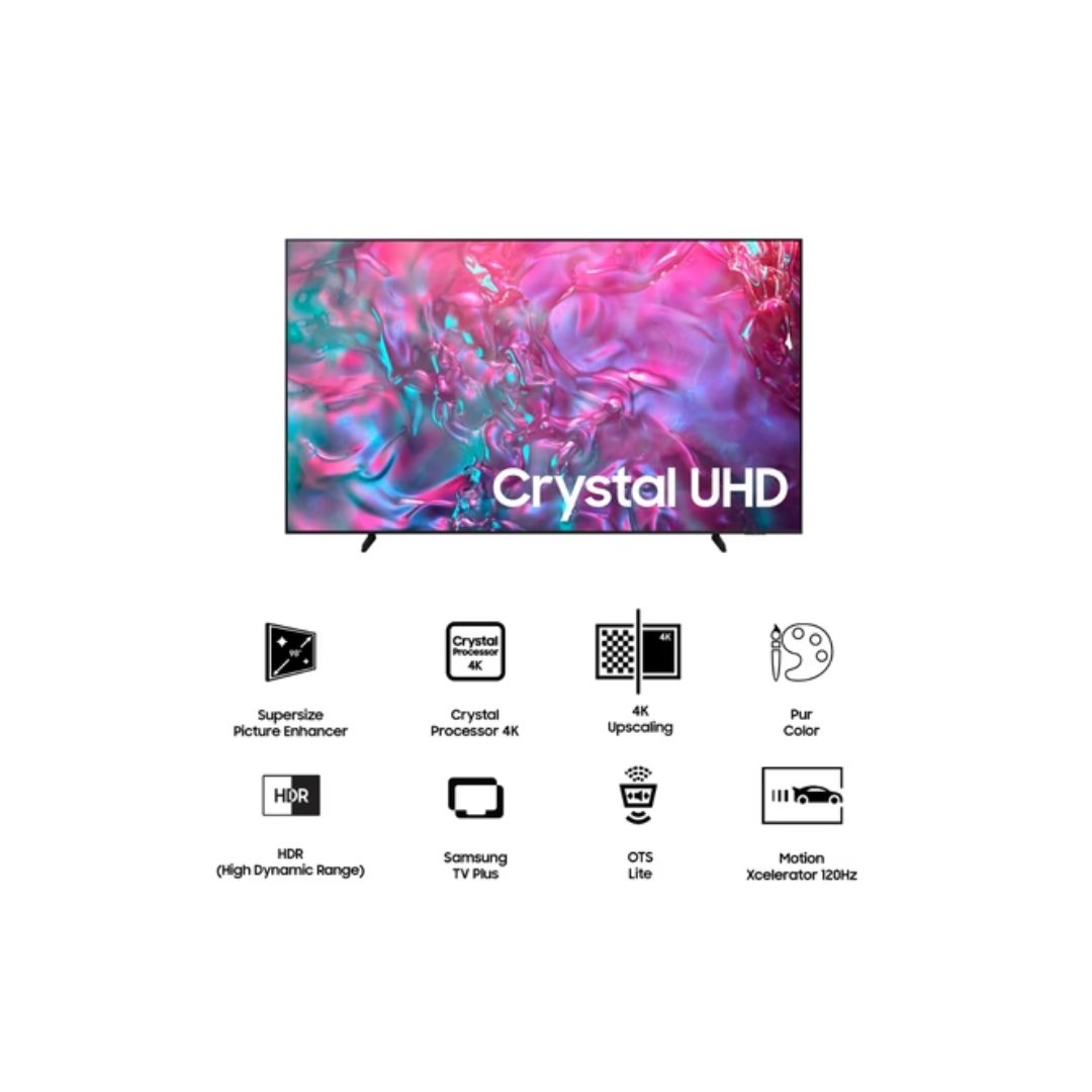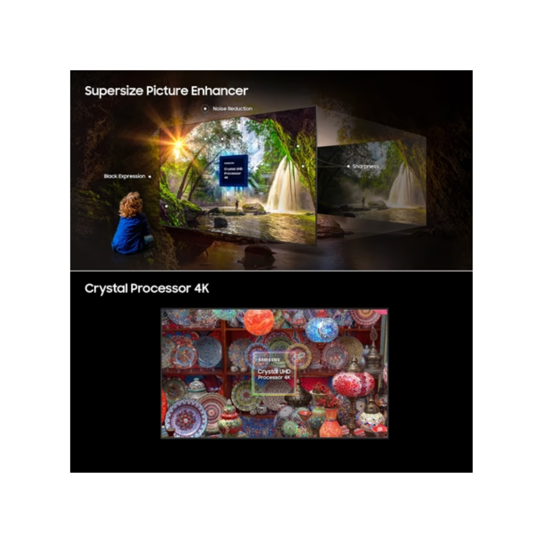 Powered by Samsung’s advanced Crystal Processor 4K, the TV intelligently optimizes picture and sound in real time for stunning clarity and vibrant visuals. The Dynamic Crystal Display enhances color accuracy, producing over a billion shades for a natural and realistic viewing experience. Whether you’re streaming your favorite movies, watching live sports, or gaming, every frame looks smooth and precise.