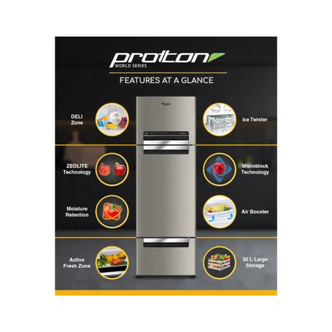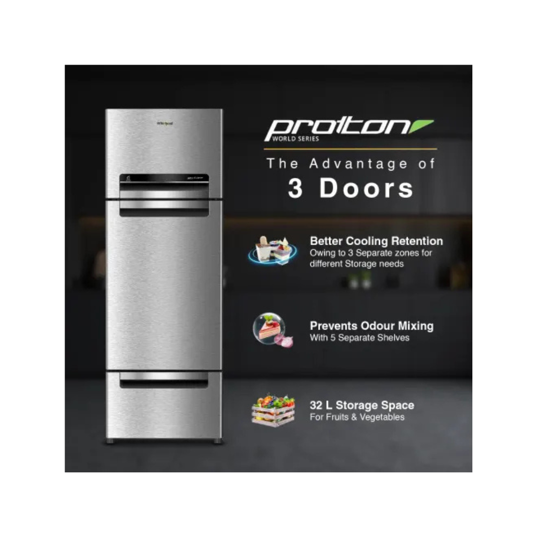 The Whirlpool 300 L Frost Free Triple Door Refrigerator (Model: FP 343D PROTTON ROY ALPHA STEEL (N)) is a perfect blend of style, innovation, and efficiency, designed to cater to the modern household’s needs. With its elegant Alpha Steel finish and premium triple-door design, it not only enhances your kitchen’s aesthetic but also ensures smart organization and advanced freshness for all your food items.